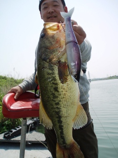 利根川水系釣行 2010年05月10日 先日利根川水系へ釣行、初めに、最近好調のゲーリー4inカットテールを投げるもほぼ無反応、しかし同船者はバックスライド系のルアーで立て続けに4本!!、しかもキロUP、あわてて僕も真似するもなぜか釣れません、少しへこみました、ここで見えバス発見!一発逆転狙いでガンクラフトジョインテッドクローマグナム(フローティング)へチェンジ、粘りに粘り写真のバスを手にすることができました、またまた寸止め49cmでしたが満足です。今年もBIGベイトにはまりそうな予感です。 «前 次» スタッフ日記